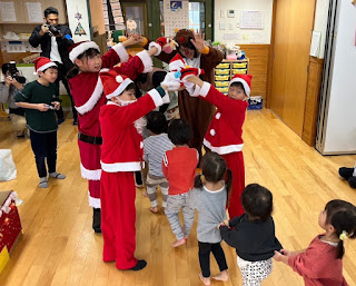 各保育園とも可愛いサンタさんとトナカイさんの登場に大盛り上がり💕一緒に歌って踊ったり、カードやプレゼントを渡しました。園児や園の先生方、保護者の方が喜んでいる姿に緊張も解け、メンバーも笑顔になっていました。メンバーが園児たちと優しくふれあう姿に私たちも目頭が熱くなりました。